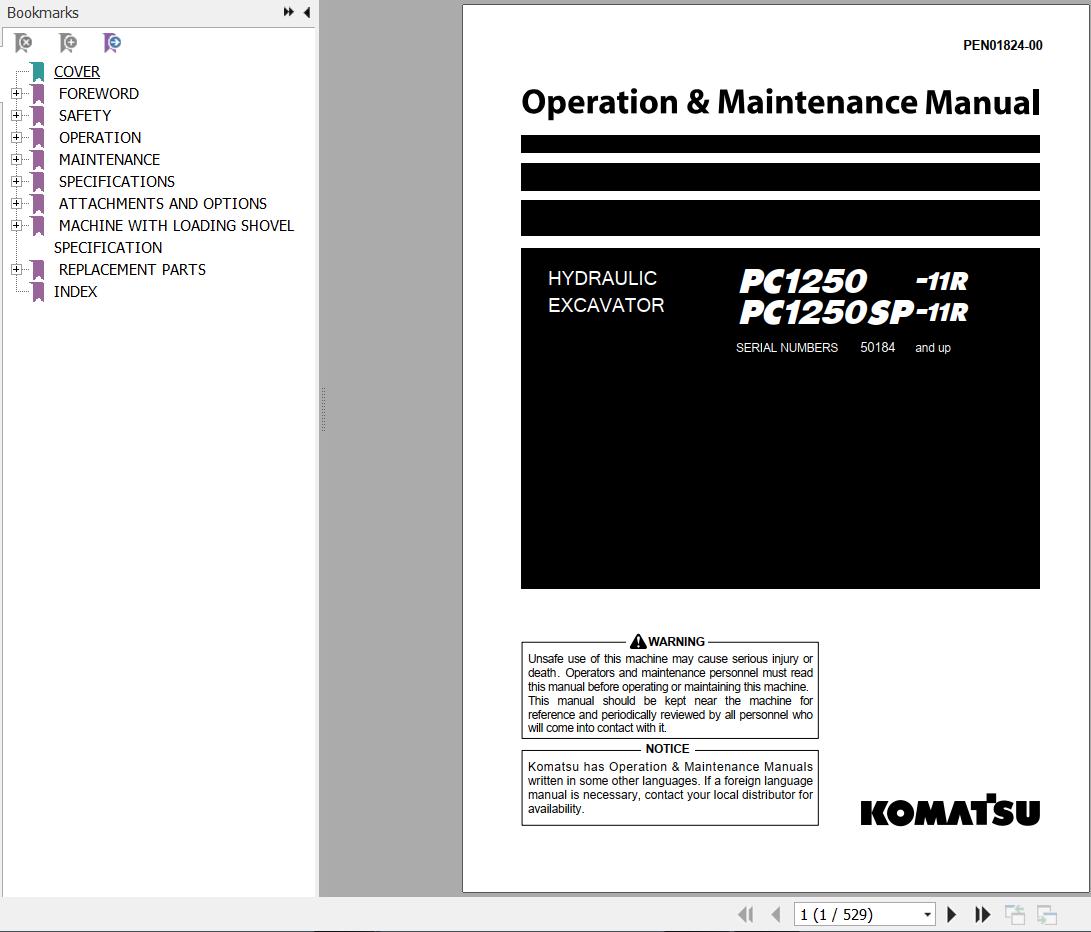 Komatsu PC1250-11R PC1250SP-11R Operation & Maintenance Manual PEN01824-00