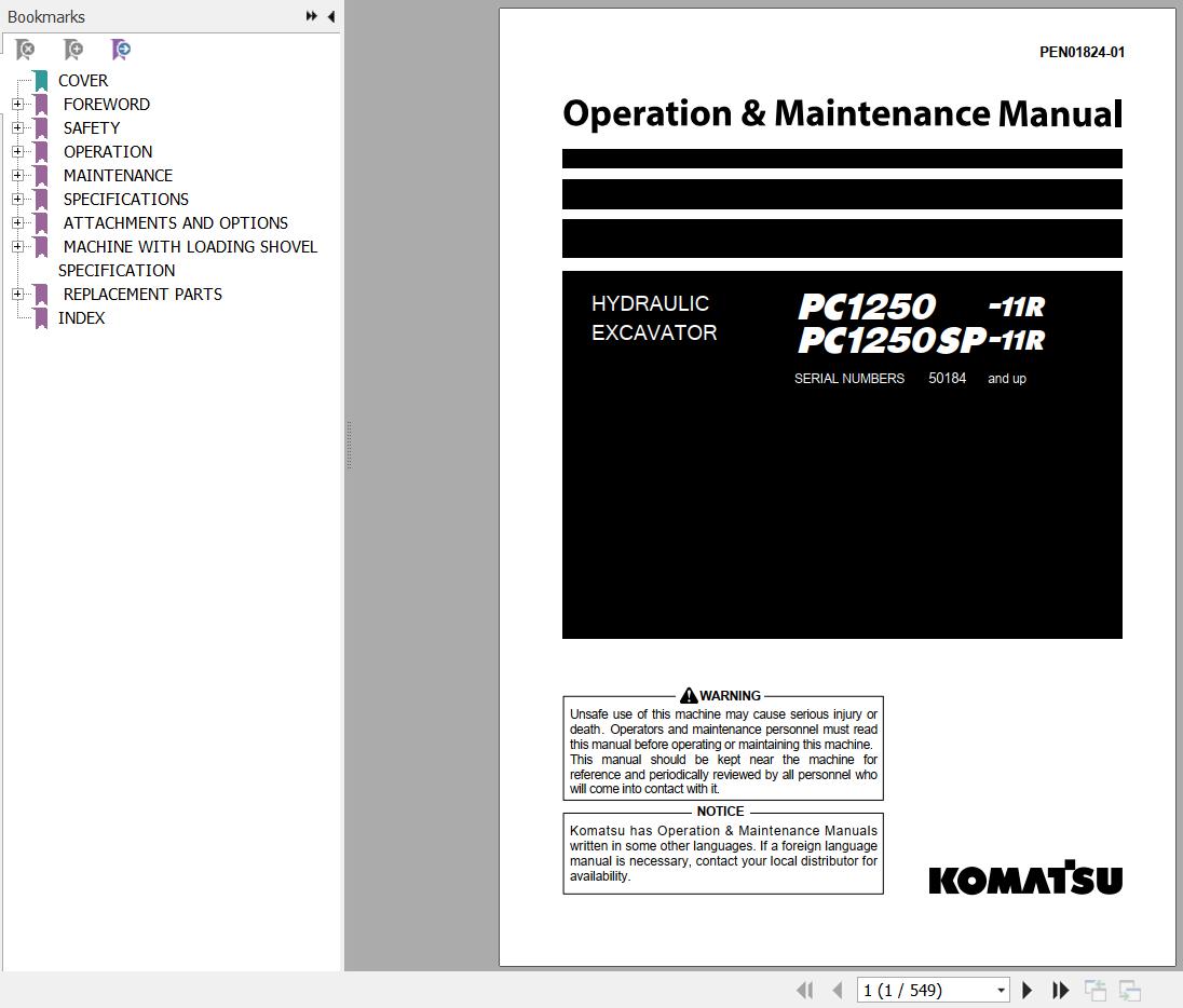 Komatsu PC1250-11R PC1250SP-11R Operation & Maintenance Manual PEN01824-01