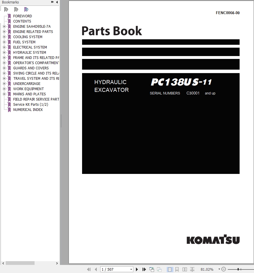 The Bookmarks of Komatsu PC138US-11 Crawler Excavators Part Book: