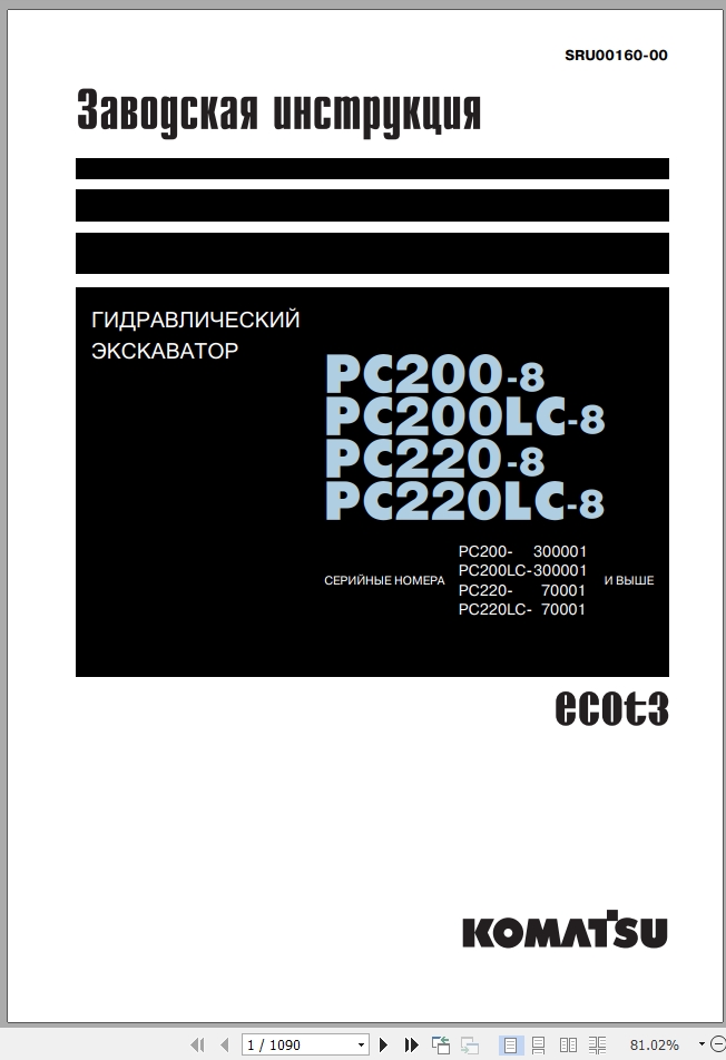 Komatsu PC200-8 PC200LC-8 PC220-8 PC220LC-8 Shop Manual SRU00160-00
