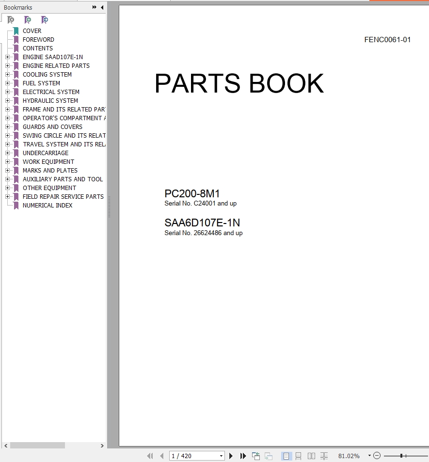 Komatsu PC200-8M1 Part Book FENC0061-01