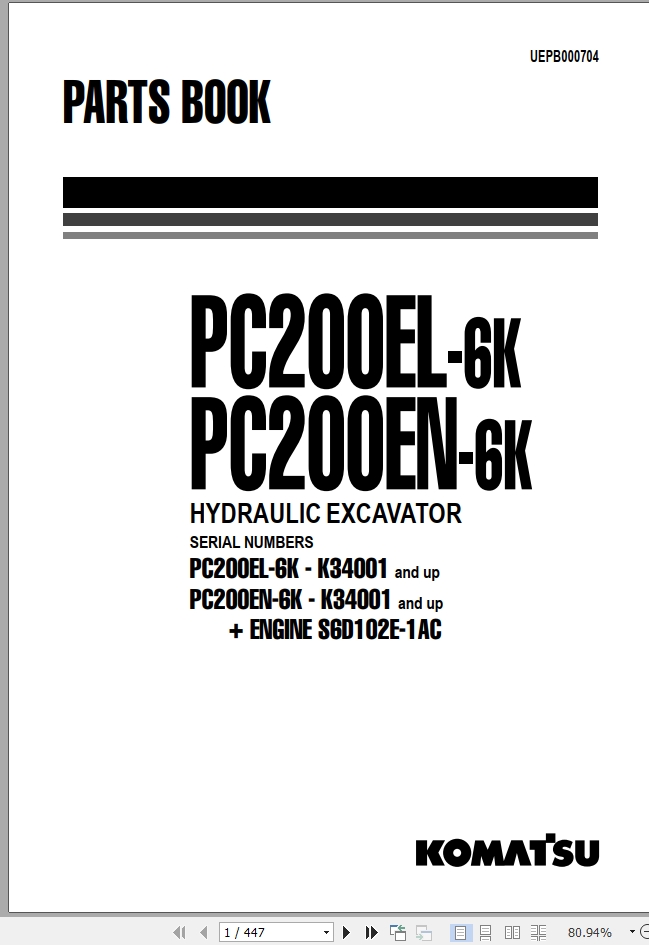 Komatsu PC200EL-6K PC200EN-6K Part Book UEPB000704