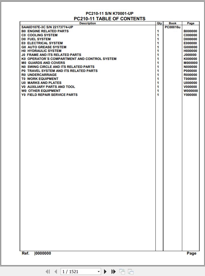 The Bookmarks of Komatsu PC210-11 K70001 Up Spare Parts Catalog: