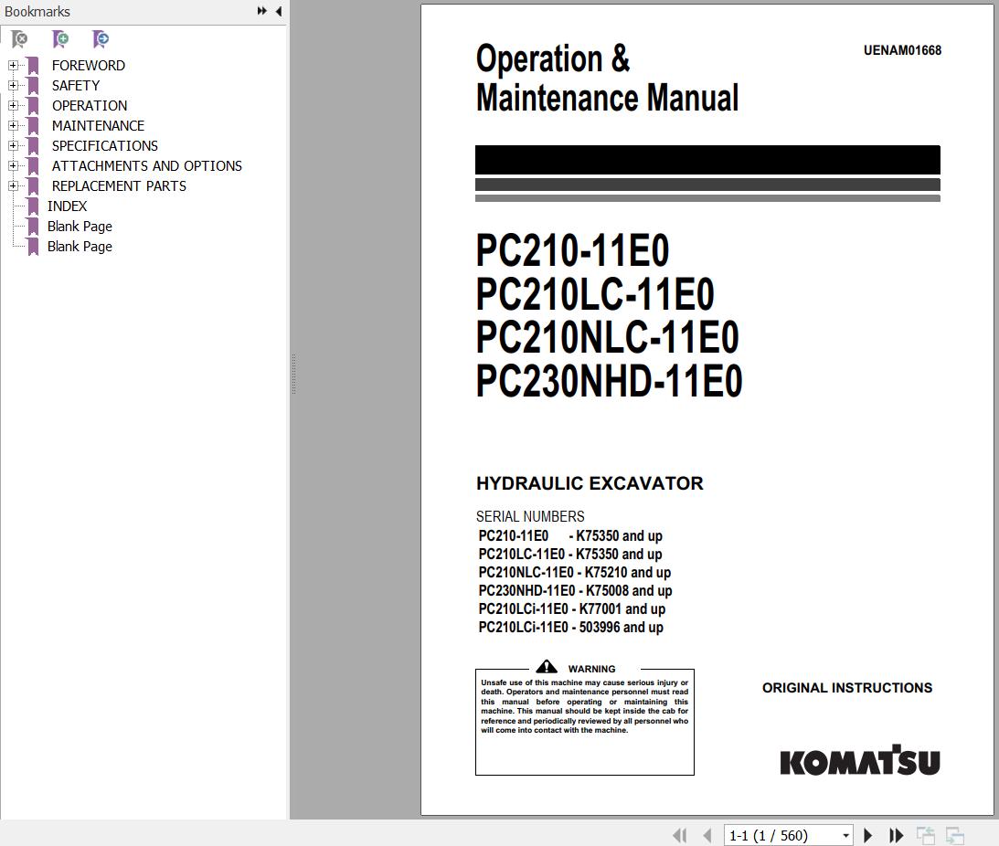 The Bookmarks of Komatsu PC210-11E0 to PC230NHD-11E0 Hydraulic Excavator Operation & Maintenance Manual: