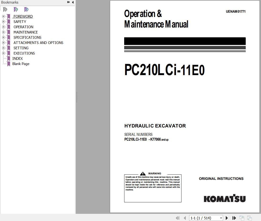 The Bookmarks of Komatsu PC210LCI-11E0 Hydraulic Excavator Operation & Maintenance Manual: