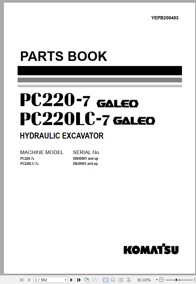 Komatsu PC220-7 PC220LC-7 Part Book YEPB200403