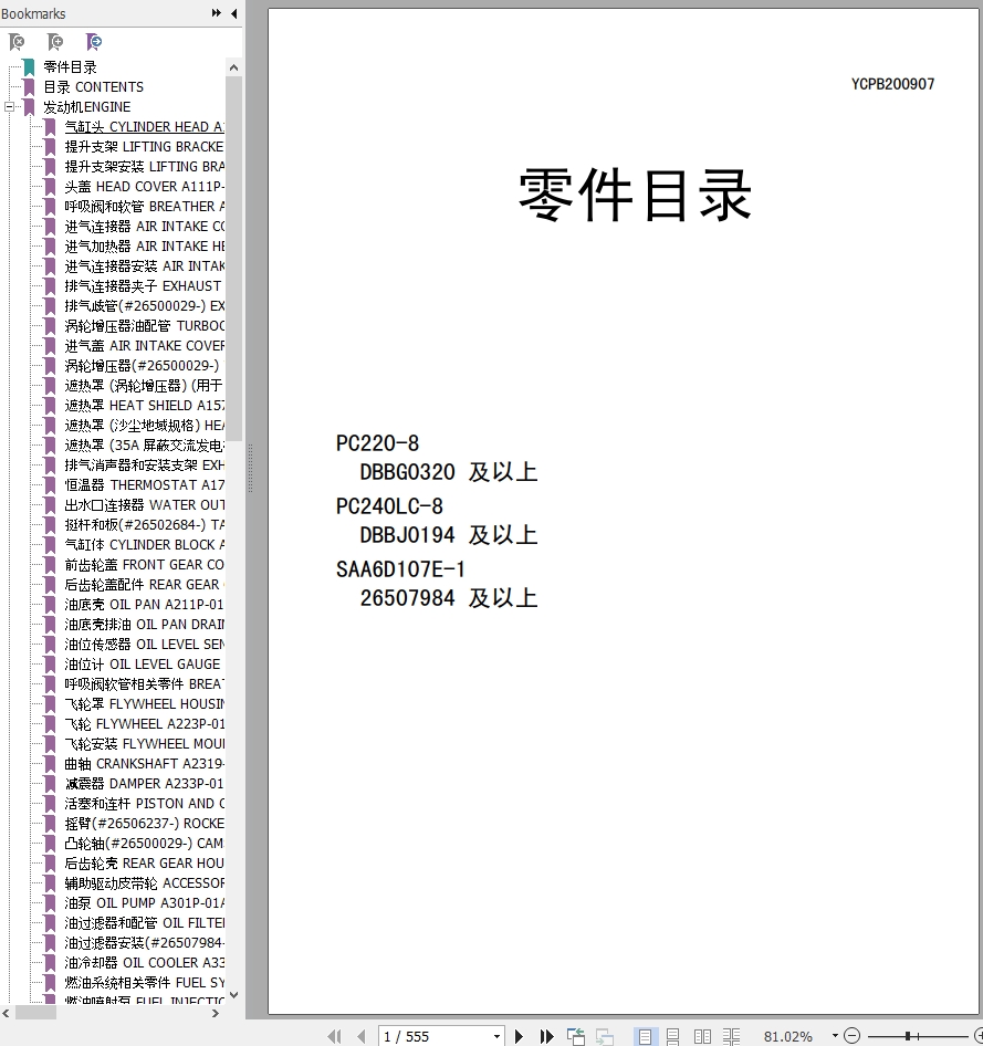 Komatsu PC220-8 PC240LC-8 Part Book YCPB200907