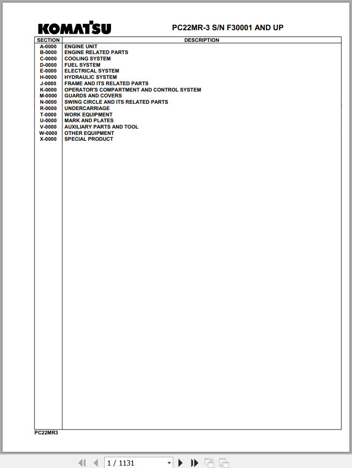 The Bookmarks of Komatsu PC22MR-3 F30001 And Up Spare Parts Catalog: