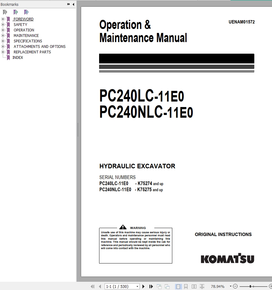 Komatsu PC240LC-11E0 PC240NLC-11E0 Operation & Maintenance Manual UENAM01572