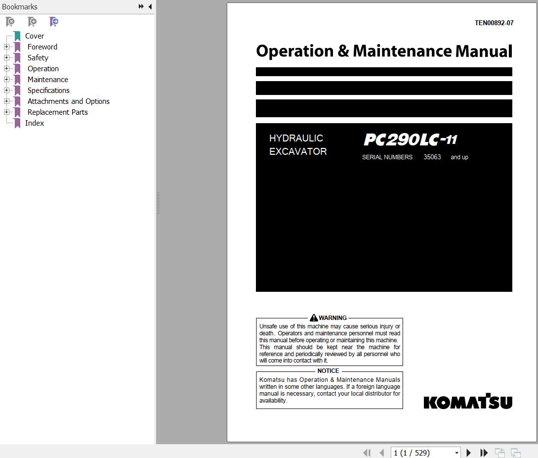 Komatsu PC290LC-11 Operation & Maintenance Manual TEN00892-07