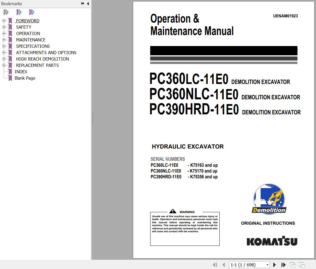 Komatsu PC360LC-11E0 PC360NLC-11E0 PC390HRD-11E0 Operation & Maintenance Manual UENAM01923