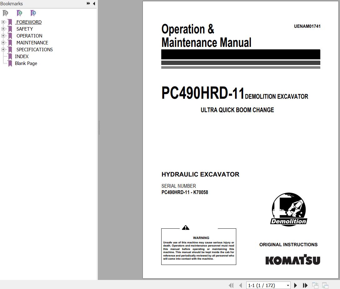 The Bookmarks of Komatsu PC490HRD-11 Hydraulic Excavator Operation & Maintenance Manual: