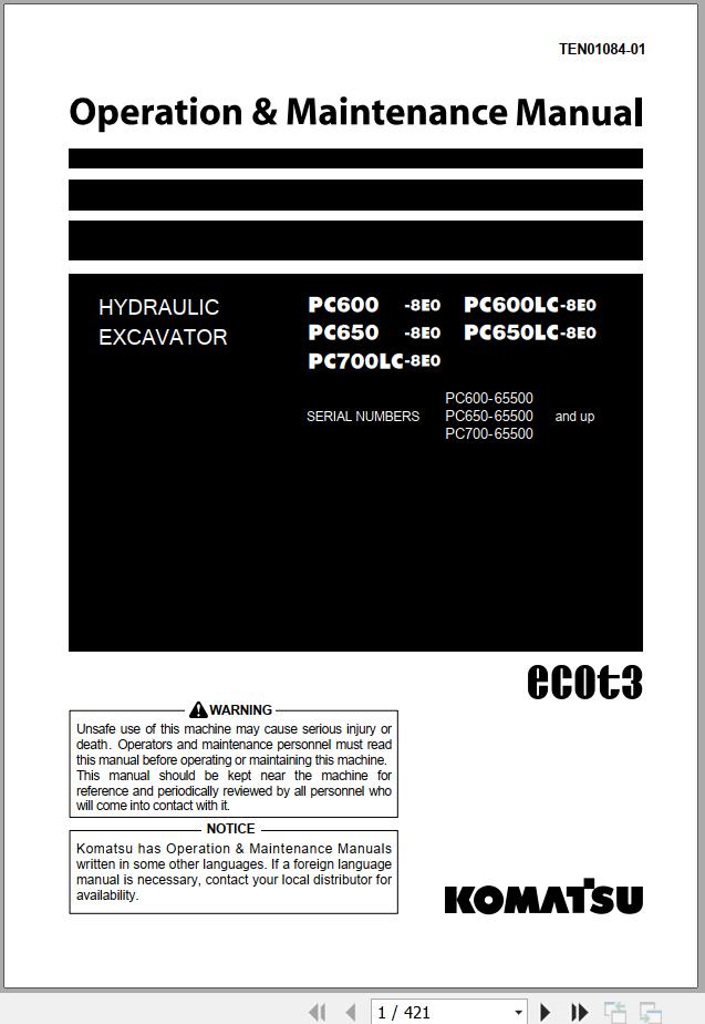 Komatsu PC600-8E0 to PC650LC-8E0 Operation & Maintenance Manual TEN01084-01