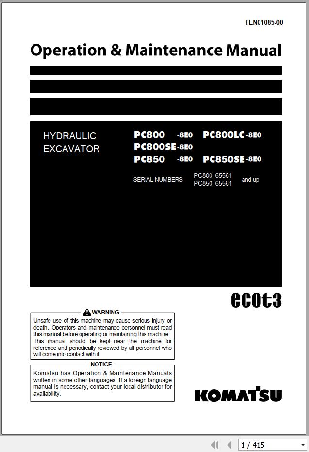 Komatsu PC800-8E0 to PC850SE-8E0 Operation & Maintenance Manual TEN01085-00