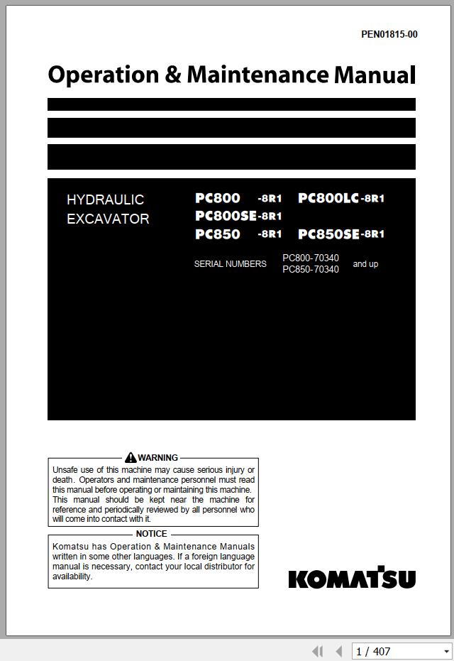Komatsu PC800-8R1 to PC850SE-8R1 Operation & Maintenance Manual PEN01815-00