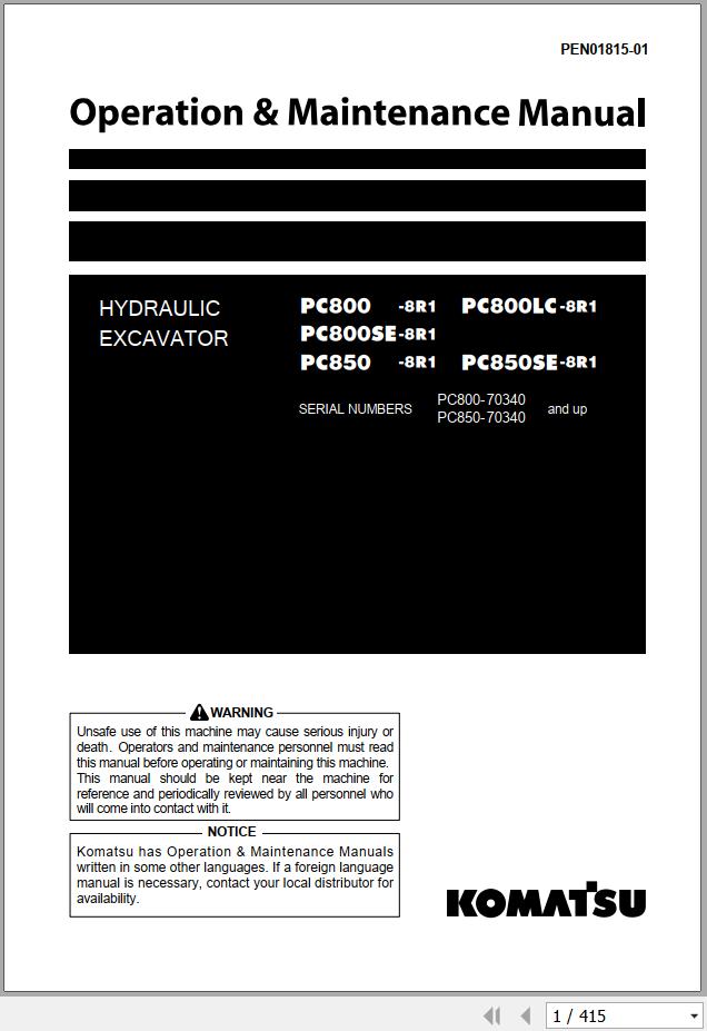 Komatsu PC800-8R1 to PC850SE-8R1 Operation & Maintenance Manual PEN01815-01