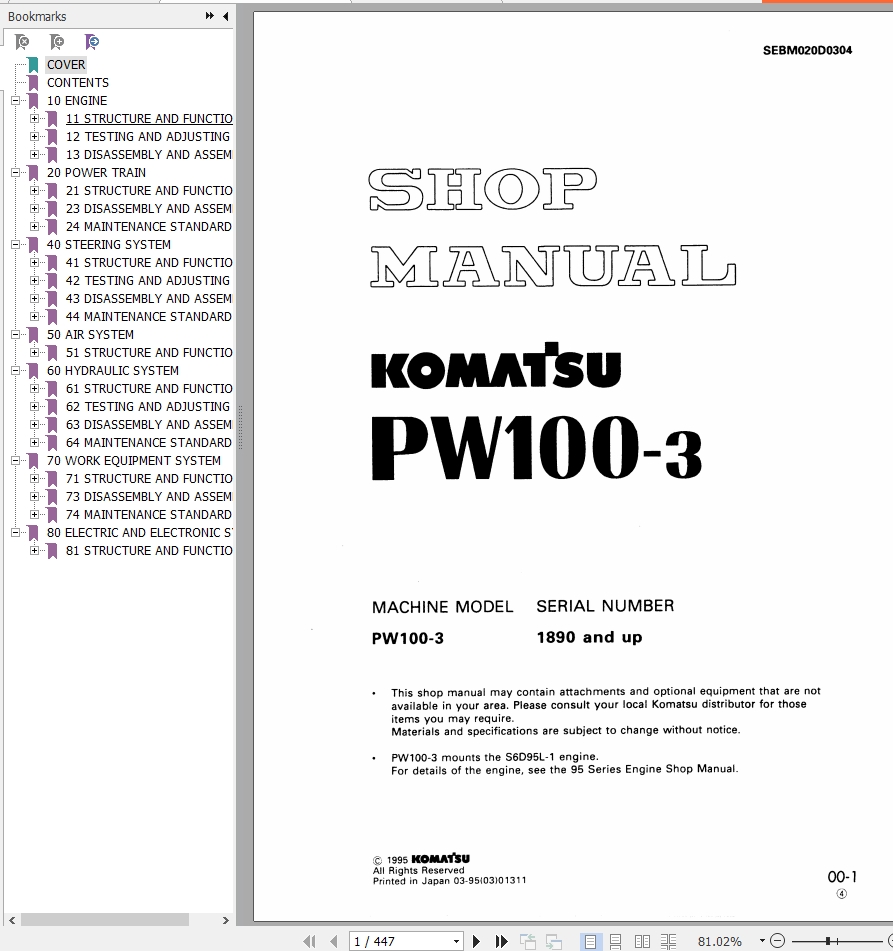 Komatsu PW100-3 Shop Manual SEBM020D0304