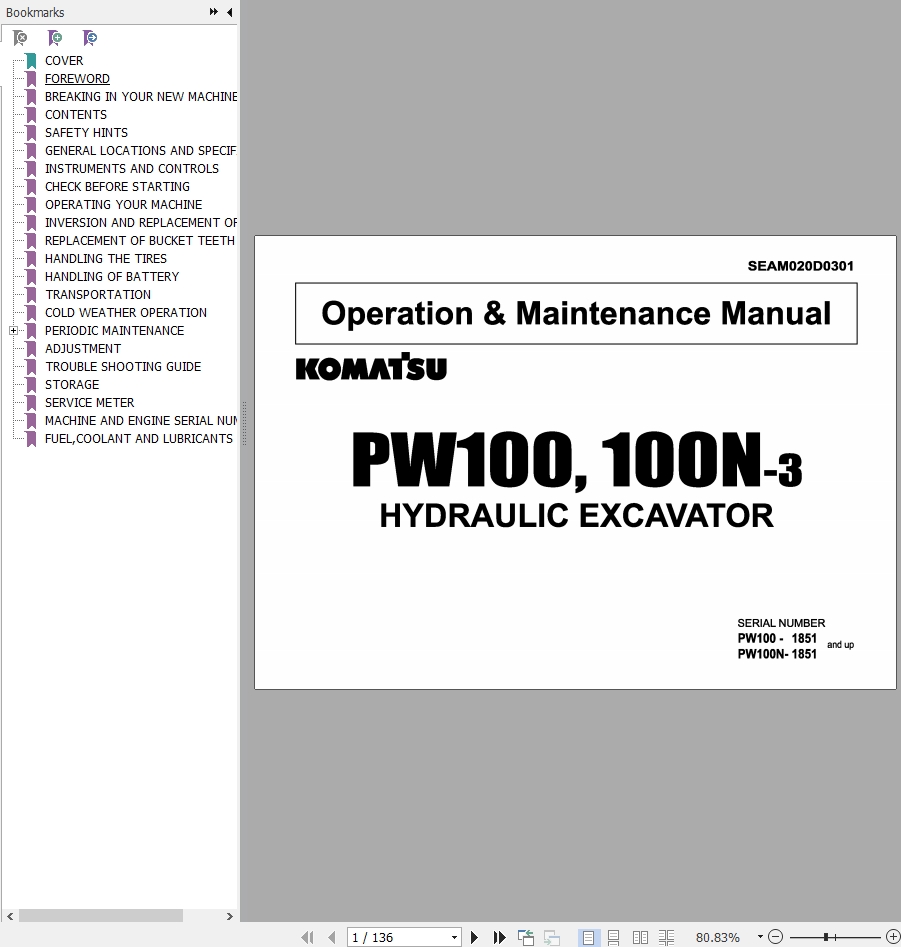 Komatsu PW100 PW100-3 Operation & Maintenance Manual SEAM020D0301