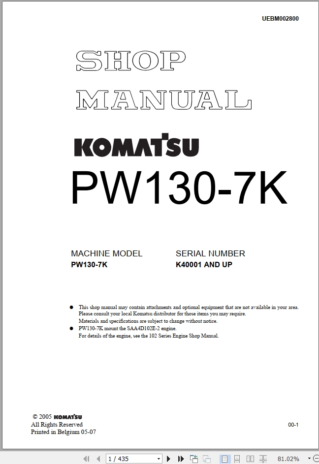 The Bookmarks of Komatsu PW130-7K Wheeled Excavator Shop Manual: