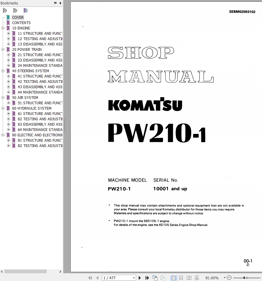 Komatsu PW210-1 Shop Manual SEBM020K0102