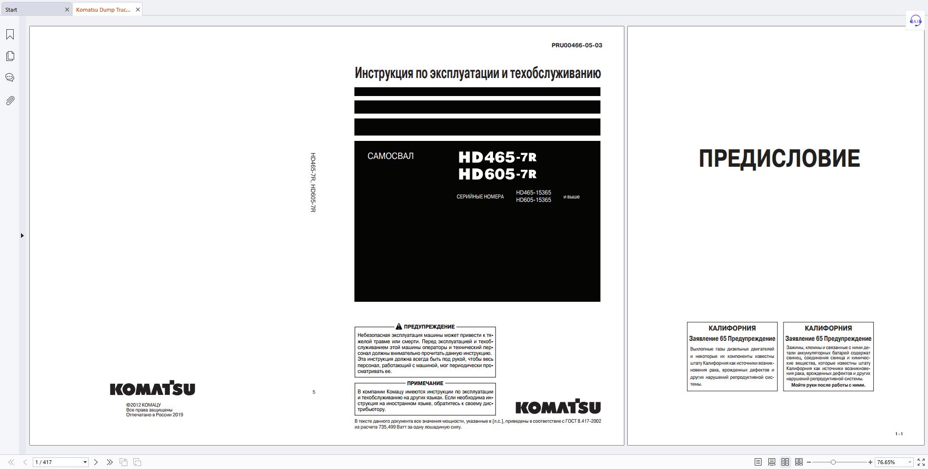 Komatsu Dump Truck HD465-7 Operation And Maintenance Manual PRU00111-00 RU PDF