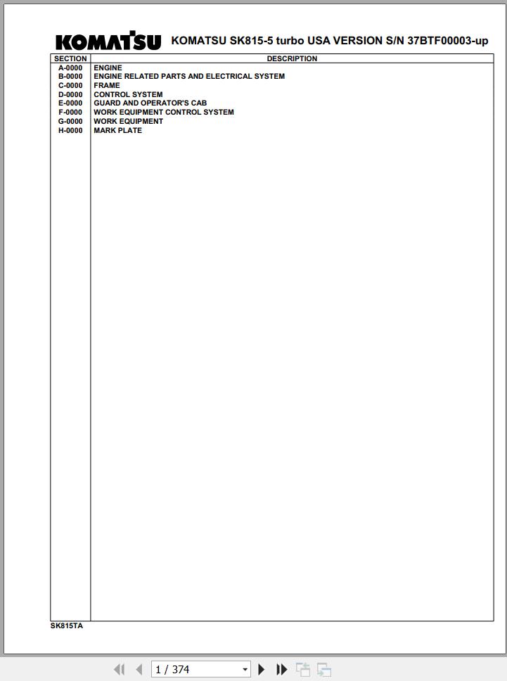 The Bookmarks of Komatsu SK815-5 turbo USA 37BTF00003 Up Spare Parts Catalog: