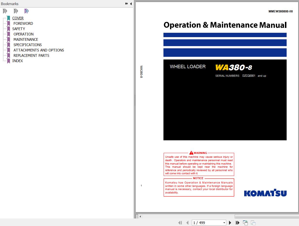 The Bookmarks of Komatsu WA380-8 Wheel Loader Operation & Maintenance Manual: