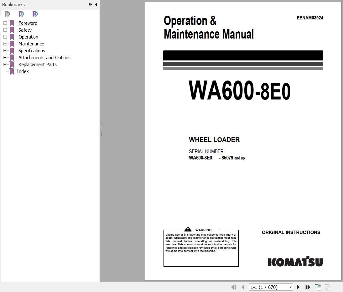 The Bookmarks of Komatsu WA600-8E0 Wheel Loader Operation & Maintenance Manual: