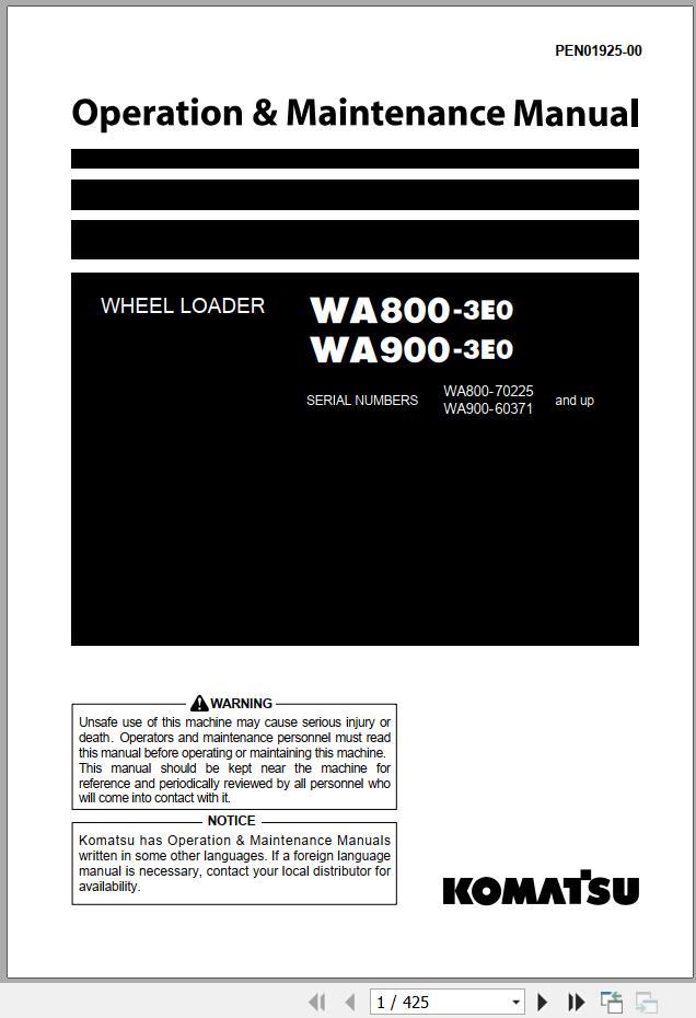 Komatsu WA800-3E0 WA900-3E0 Operation & Maintenance Manual PEN01925-00