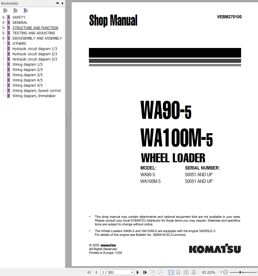 Komatsu WA90-5 WA100M-5 Shop Manual VEBM270100