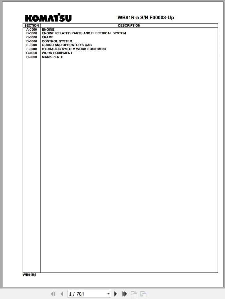 The Bookmarks of Komatsu WB91R-5 F00003 Up Spare Parts Catalog: