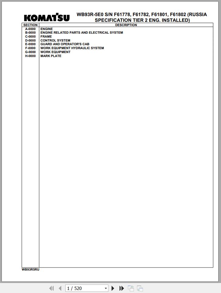 The Bookmarks of Komatsu WB93R-5E0 F61778-F61782 Spare Parts Catalog: