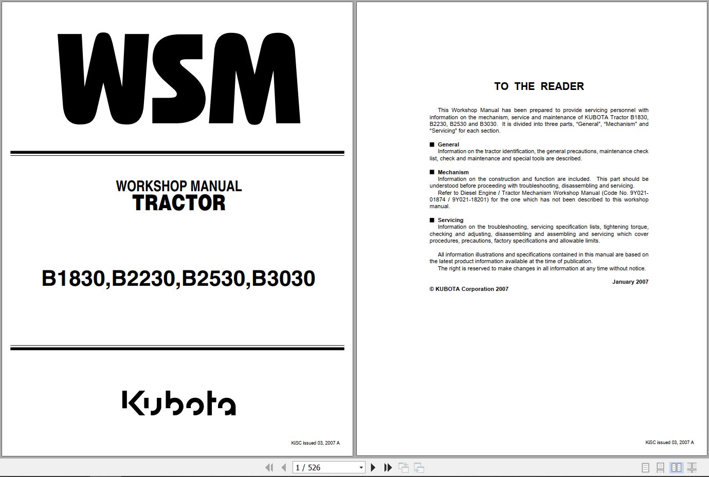 Kubota B1830 B2230 B2350 B3030 Workshop Manual 9Y111-00031 2007 PDF