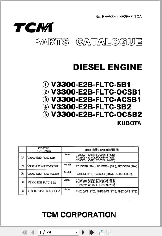 Kubota Engine V3300 Series For TCM FD20C6H To FHD30W3 Parts Catalog PE-V3300-E2B-FLTCA
