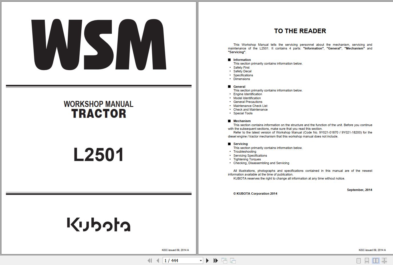 Kubota L2501 Workshop Manual 9Y111-11210 2014 PDF