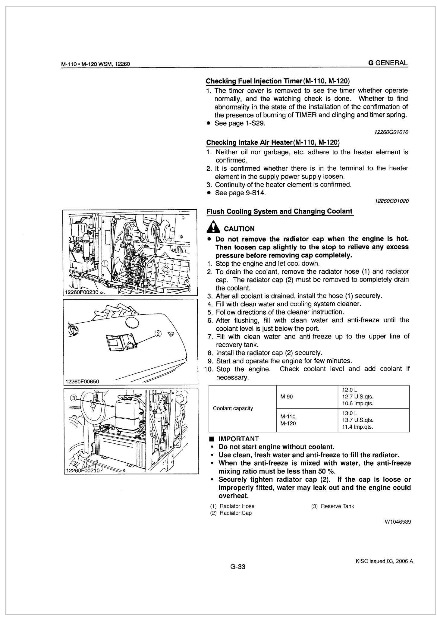 - Under the heading “General” section comes general precautions, check and maintenance and special tools. Other section, there are troubleshooting, servicing specification lists, checking and adjusting, disassembling and assembling, and servicing which cover procedures, precautions, factory specifications and allowable limits.