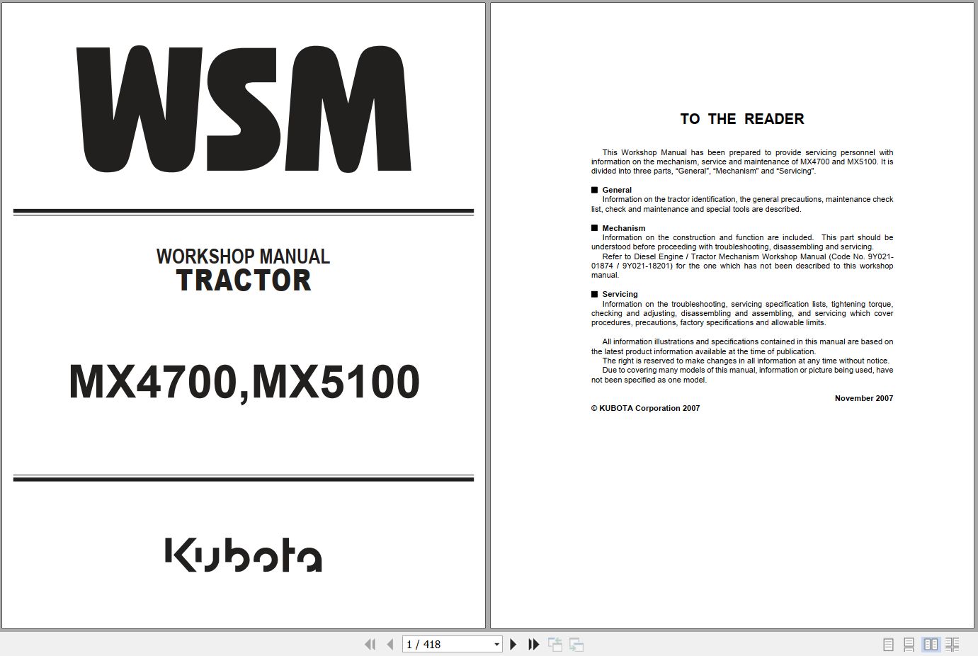 Kubota MX4700 MX5100 Workshop Manual 9Y111-00874 2007 PDF