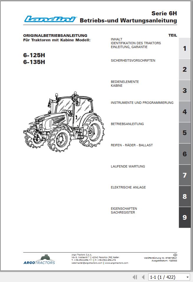 Landini 6-125H 6-135H Maintenance Operator Manual 6708735A1