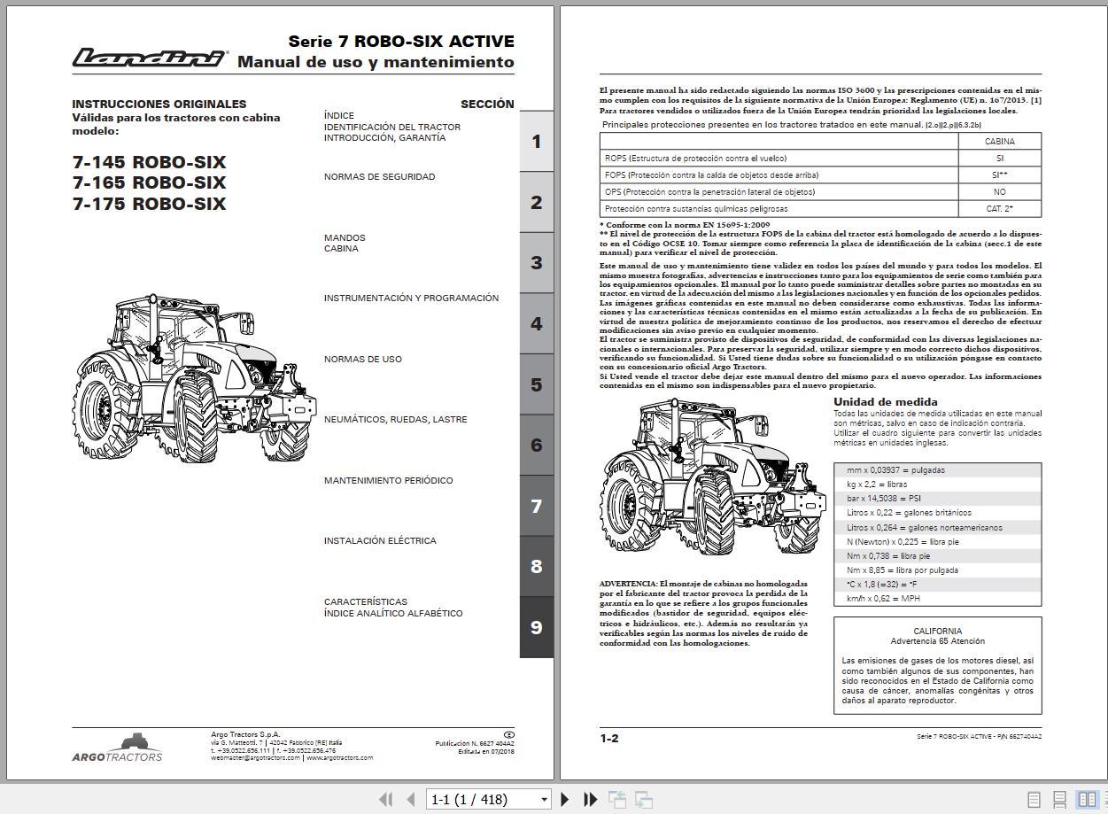 Landini 7-145 7-165 7-175 ROBO-SIX ACTIVE Maintenance Operators Manual 6627404A2