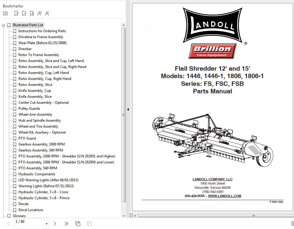 Landoll 1446 1446-1 1806 1806-1 Series FS FSC FSB Flail Shredder 12'and15' Parts Manual F-629-1022
