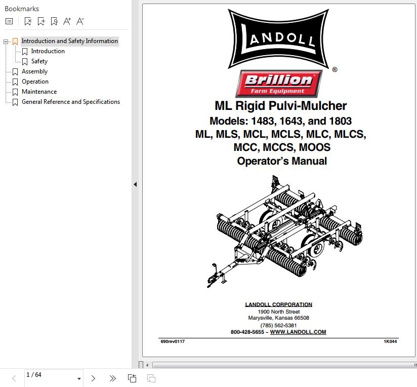 Landoll 1483 1643 And 1830 ML MLS MCL MLC MLCS MCC MCCS MOOS Rigid Pulvi-Mulcher Operator’s Manual 1K044