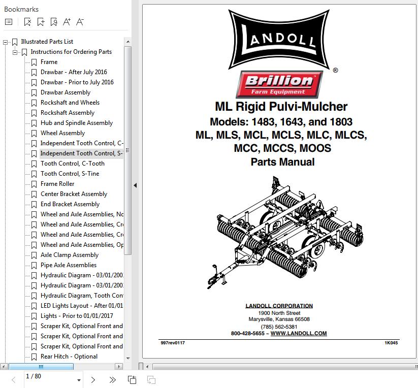 Landoll 1483 1643 AND 1830 ML MLS MCL MLC MLCS MCC MCCS MOOS Rigid Pulvi-Mulcher Parts Manual 1K045