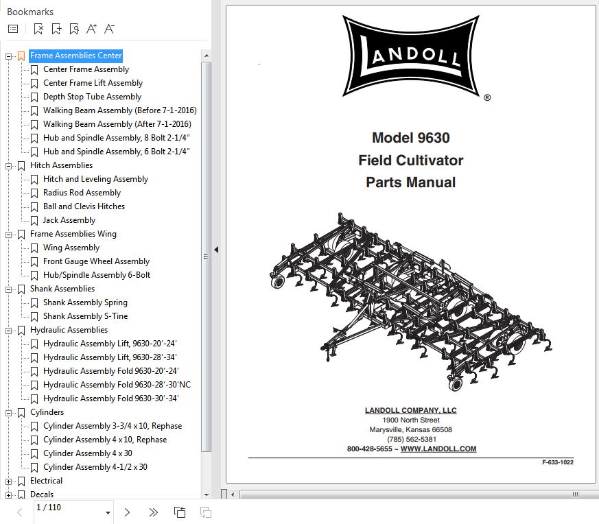 Landoll 9630 Field Cultivator Parts Manual F-633-1022
