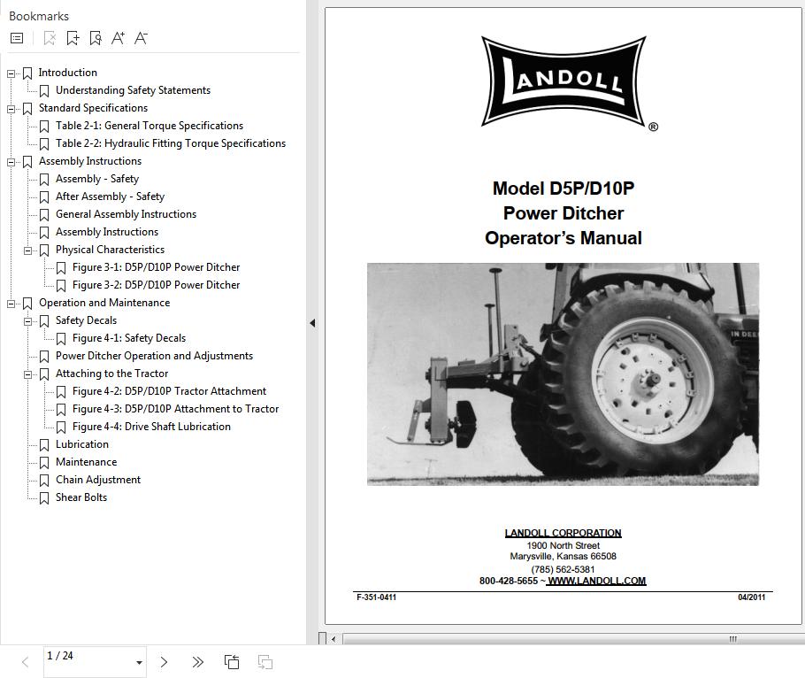 Landoll D5P D10P Power Ditcher Operator's Manual F-351-0411