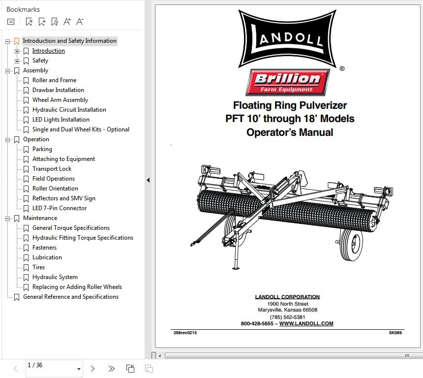 Landoll PFT10 Through PFT18 Floating Ring Pulverizer Operator's Manual 5K089rev0215