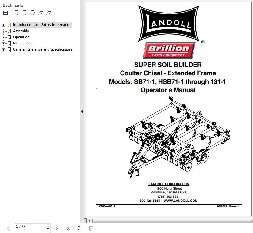 Landoll SB71-1 HSB71-1 Through 131-1 Super Soil Builder Coulter Chisel Operator’s Manual 1K705rev0319
