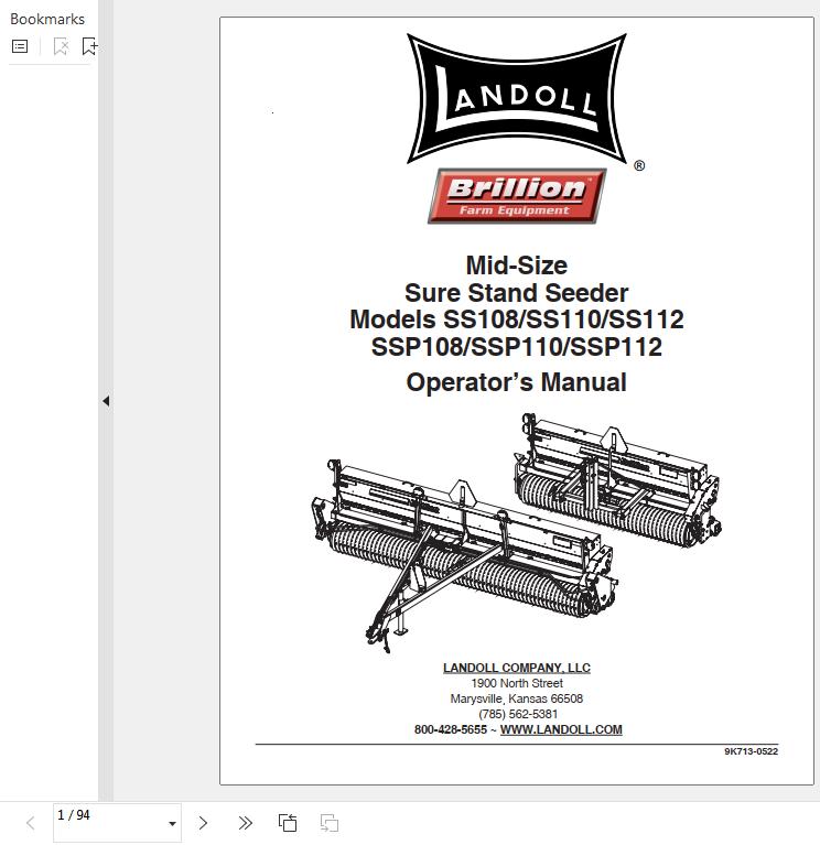 Landoll SS108 SS110 SS112 SSP108 SSP110 SSP112 Mid-Size Sure Stand Seeder Operator’s Manual 9K713-0522