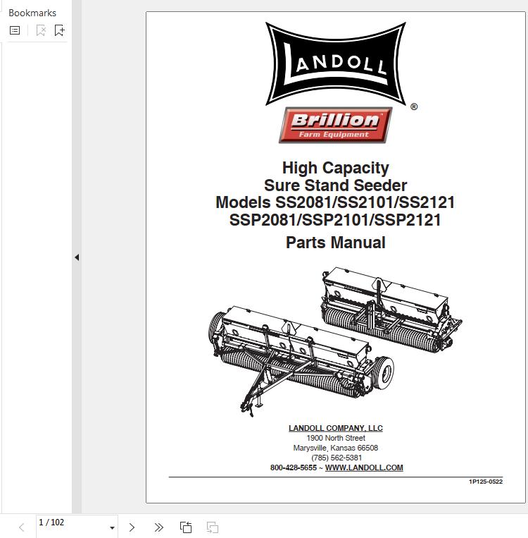 Landoll SS2081 SS2101 SS2121 SSP2081 SSP2101 SSP2121 High Capacity Sure Stand Seeder Parts Manual 1P125-0522