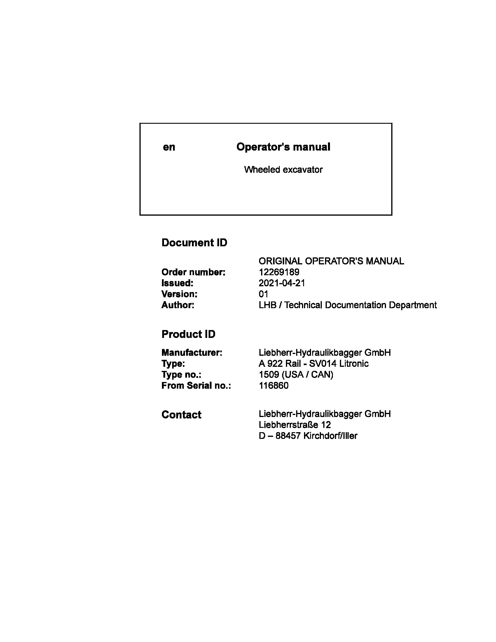 Liebherr A922 Rail SV014 Litronic Original Operators Manual 12269189 2021