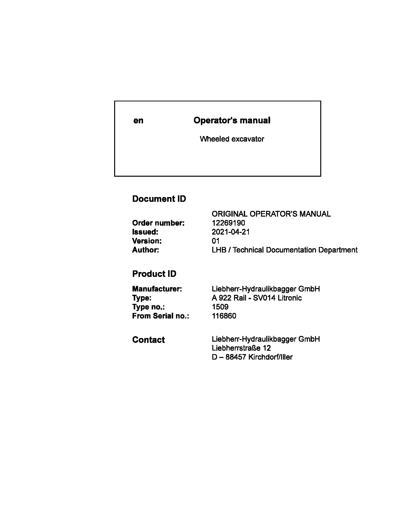 Liebherr A922 Rail SV014 Litronic Original Operators Manual 12269190 2021